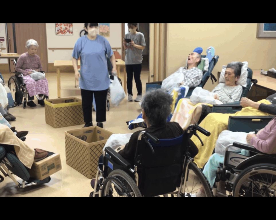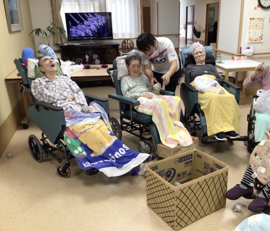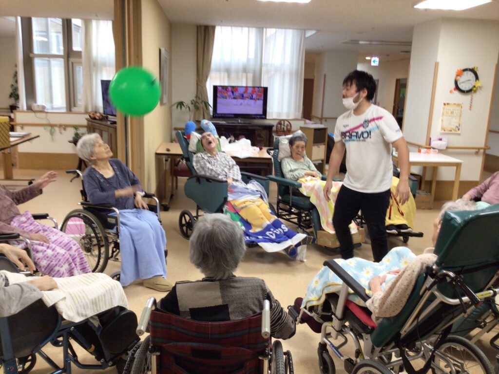 風船バレーでは職員数名が輪の中に入り入居者様達に向かって叩くと笑顔で返してくれていました😆
