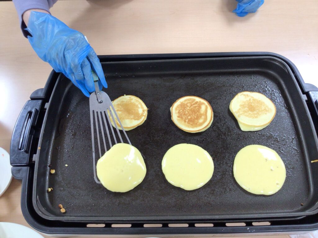 生地作り、パンケーキをひっくり返すのを手伝ってくれたりして笑いながら楽しく作りました😃