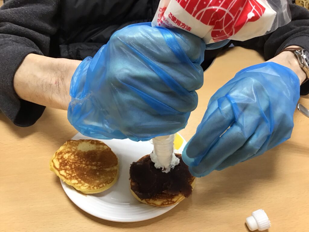 あんこ、クリームたっぷりのどら焼きが出来上がり、皆さん喜んで召し上がられました♪