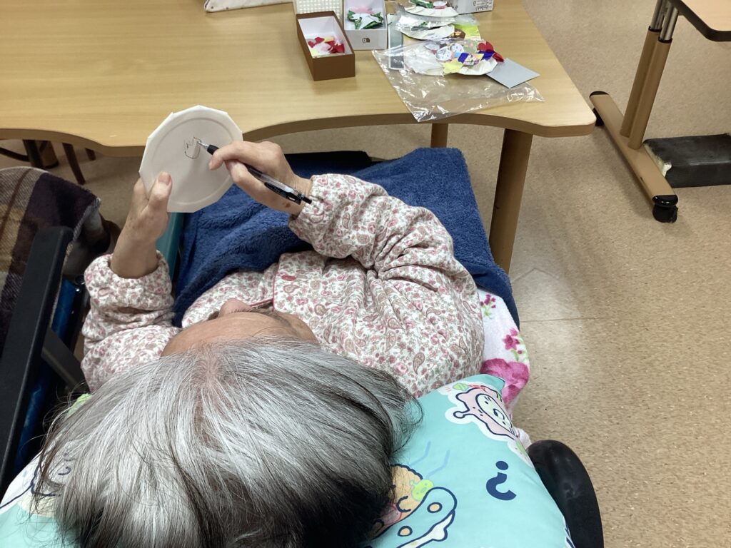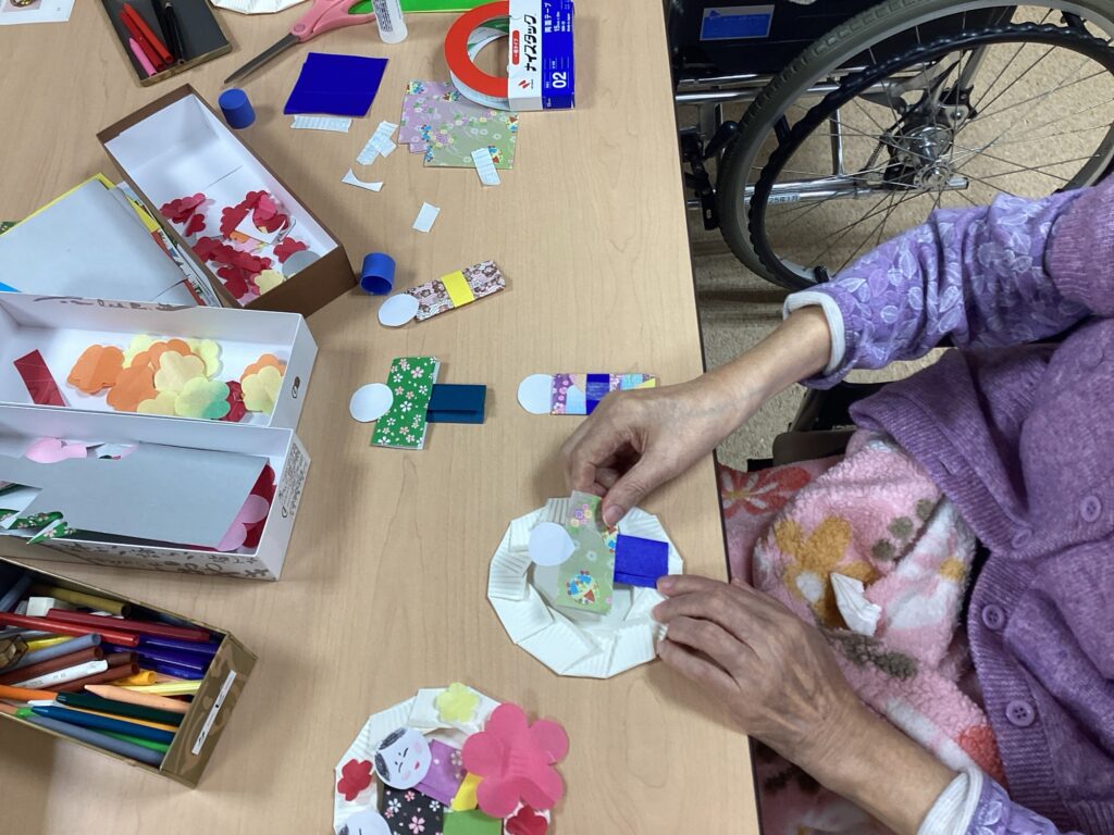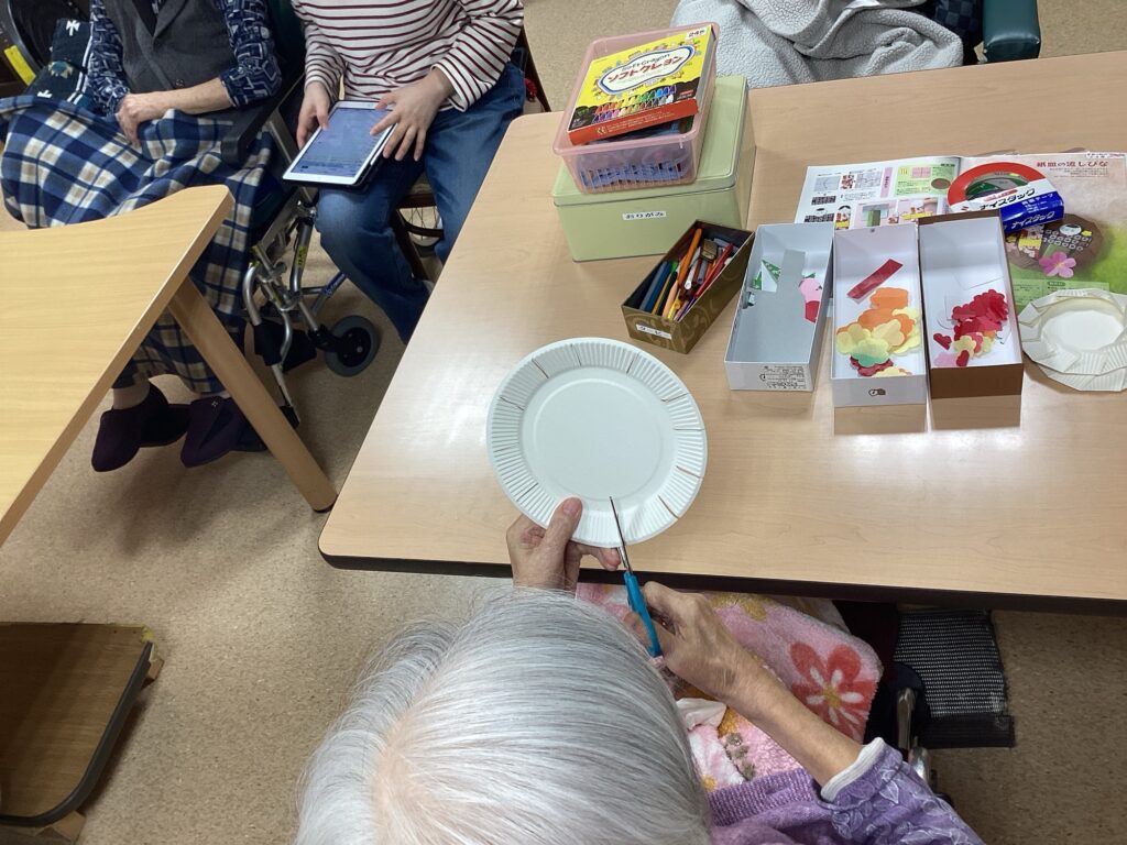紙皿に切り込みを入れる、レイアウトを考えて貼り付けるなど、できることをしていただきました